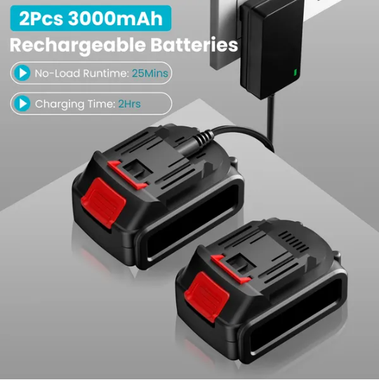 *Cordless & Lightweight Design*:Powered by 2Pcs 3000mAh rechargeable batteries,supporting total of 50mins no-load working time after fully charged,suitable for extended use during gardening sessions without frequent interruptions. Moreover,its lightweight and cordless design eliminates the hassle of tangled cords or limited mobility,ensuring effortless wood cutting,tree pruning and gardening without a sore hand.