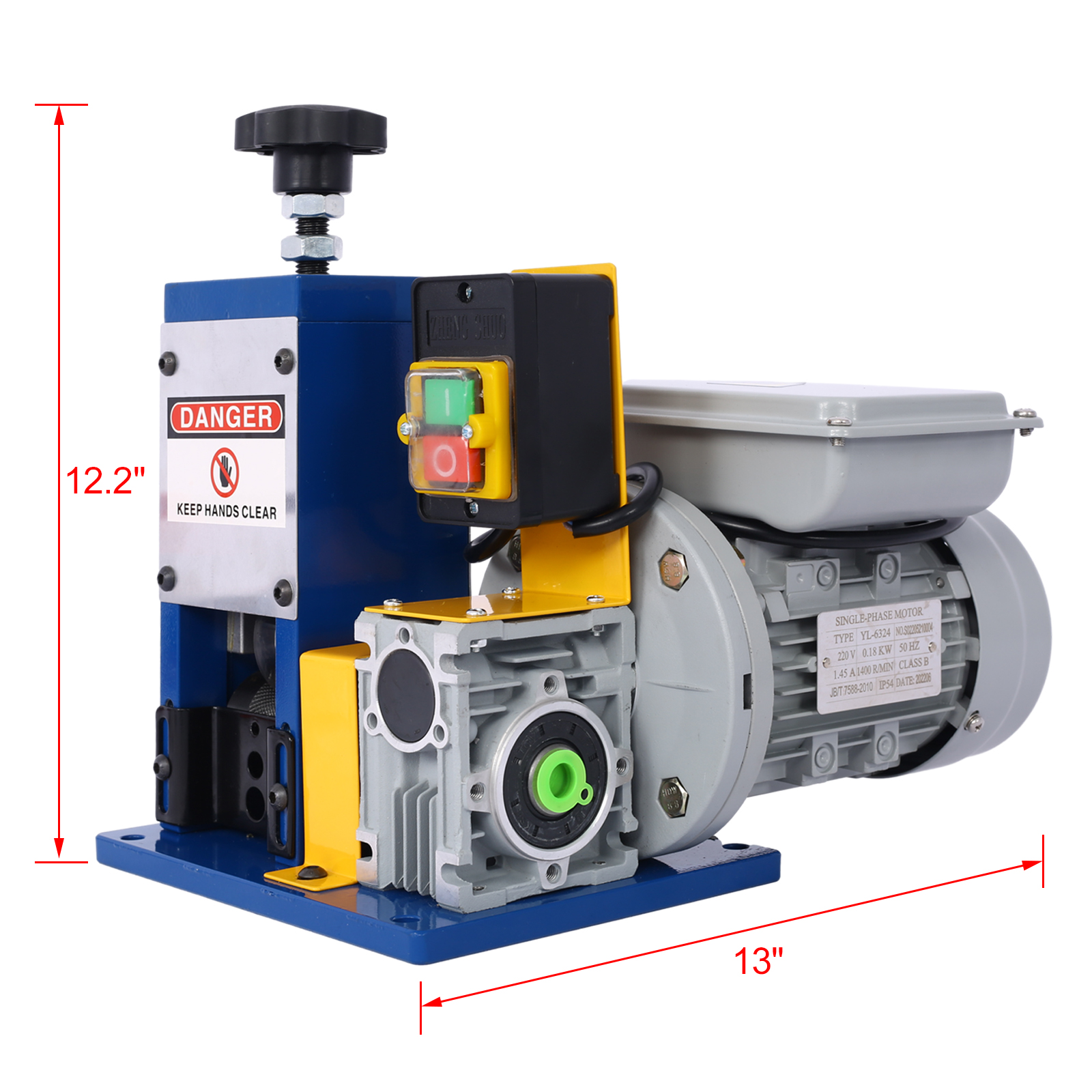 Durable and Reliable: Crafted from solid aluminum alloy, our wire stripper is built to withstand tough environments and heavy-duty usage. With high hardness blades, it ensures operational stability, making it a long-lasting tool you can rely on. Versatile Compatibility: Powered by an electric motor, this wire stripper utilizes drill-driven technology. The adjustable blades and rollers provide compatibility with a wide range of wire sizes, accommodating diameters from 1.5mm (0.05") up to 25mm (1"). Say goodbye to the hassle of finding the right tool for different wire sizes! Efficient Stripping Performance: Featuring a powerful 180W motor, our wire stripper is designed to save you valuable time, effort, and money. Equipped with a gearbox, it achieves a fast stripping speed of 60 feet per minute, ensuring you can complete tasks efficiently. The hands-free design further enhances convenience and security. User-Friendly Operation: In the event of an unforeseen wire jam, our wire stripper comes with an emergency stop button. Operating this tool is as simple as slipping the intact wire into the feeding hole and turning on the switch. Just remember to keep your fingers clear while it's in use! Wide Range of Applications: Our multi-functional machine is perfect for handling both hardwire and soft wire. Whether you need to recycle copper wire by detaching plastic and rubber insulation from undamaged scraps, or you have other wiring tasks, this wire stripper is a must-have tool for your workshop or home. Experience its versatility and efficiency today!
