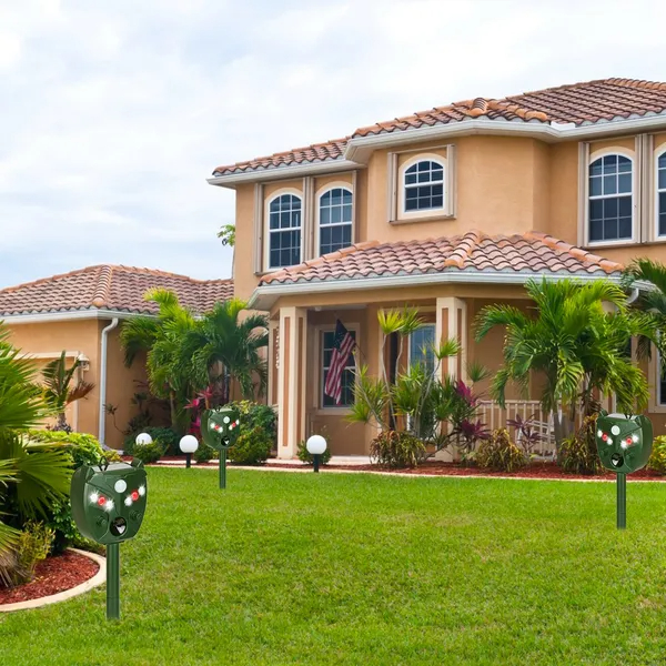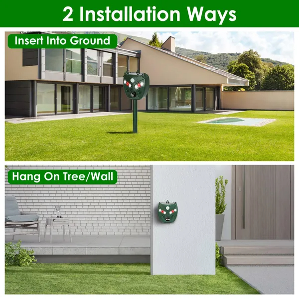 *2 Installation Ways*:The ultrasonic solar animal repeller offers versatile installation options,allowing you to hang it on walls or trees or secure it into the ground using the included stake. This flexibility ensures optimal positioning for maximum coverage and effectiveness,making it suitable for various outdoor environments like gardens,yards,or farms.