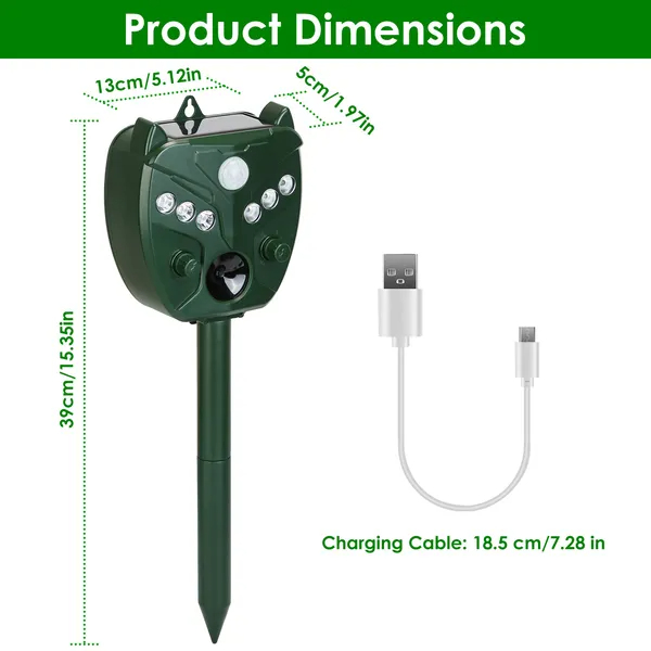 *Solar & USB Charging*:Powered by solar energy or micro USB charging,the outdoor ultrasonic squirrel chaser can provide round-the-clock protection day and night,regardless of sunlight.