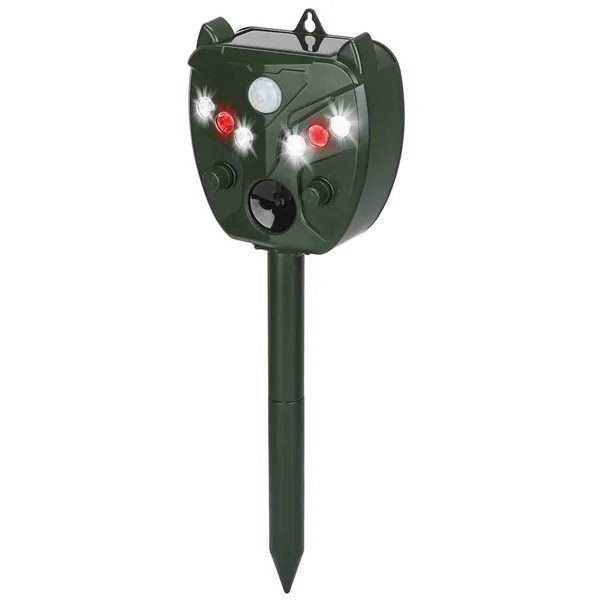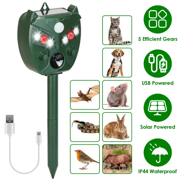 *5 Efficient Gears*:Our ultrasonic solar animal repeller provides 5 specially designed gears,which utilize 13.5-45.5KHz ultrasound,alarm sound and strobe light. These can definitely drive the unwanted animals away,such as moles,bats,squirrels,hedgehogs,birds,wild cats,wild dogs,wild boars etc.. The stimulate police alarm whistle can even scare thieves away to protect our garden and house.